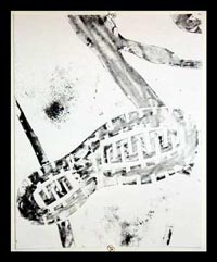 The Relief print for the BROADSTREET BROADSIDE event is 2ft x 2ft. However, most of the prints I have for sale are not of the entire image. The image was created by drawing on Davy board (a hard cardboard) and cutting it out. Then I took the parts and adhered them to a plywood square and coated it. (Term = Collagraph) . |